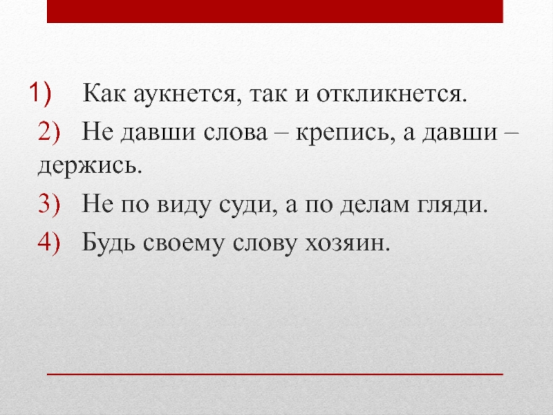 Как аукнется, так и откликнется.2)  Не давши слова – крепись, а давши – держись.3)  Не