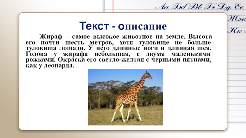 Текст - описание 		Жираф – самое высокое животное на земле. Высота его почти шесть