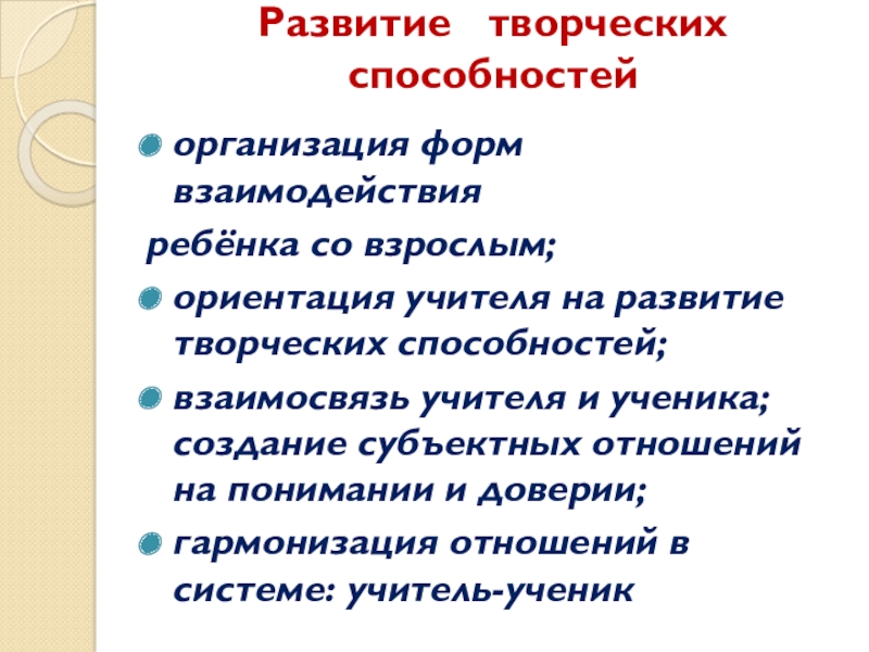 взаимосвязь учителя и ученика; создание субъектных отношений на понимании и доверии;