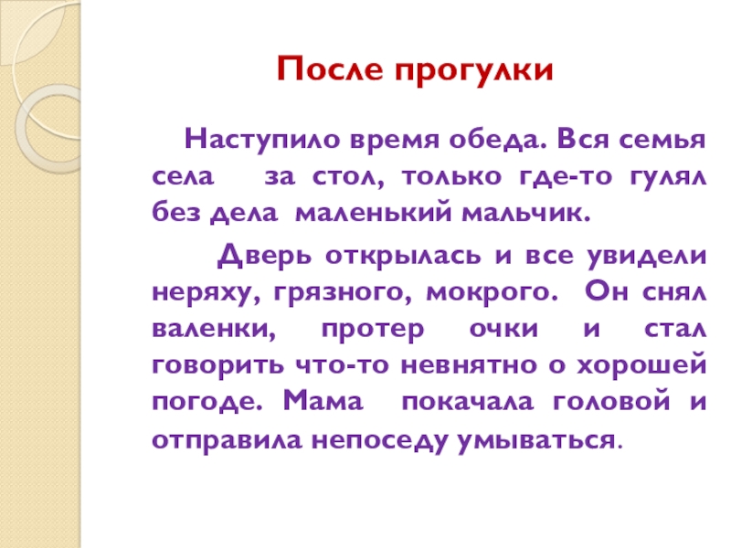 Дверь открылась и все увидели неряху, грязного, мокрого. Он снял валенки, протер очки и стал говорить что-то невнятно о хорошей погоде. Мама покачала головой и отправила непоседу умываться.