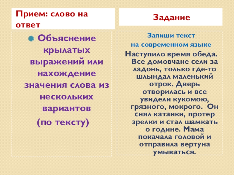Наступило время обеда. Все домовчане сели за ладонь, только где-то шлындал маленький отрок. Дверь отворилась и все увидели кукомою, грязного, мокрого. Он снял катанки, протер зрелки и стал шамкать о године. Мама покачала головой и отправила вертуна умываться.