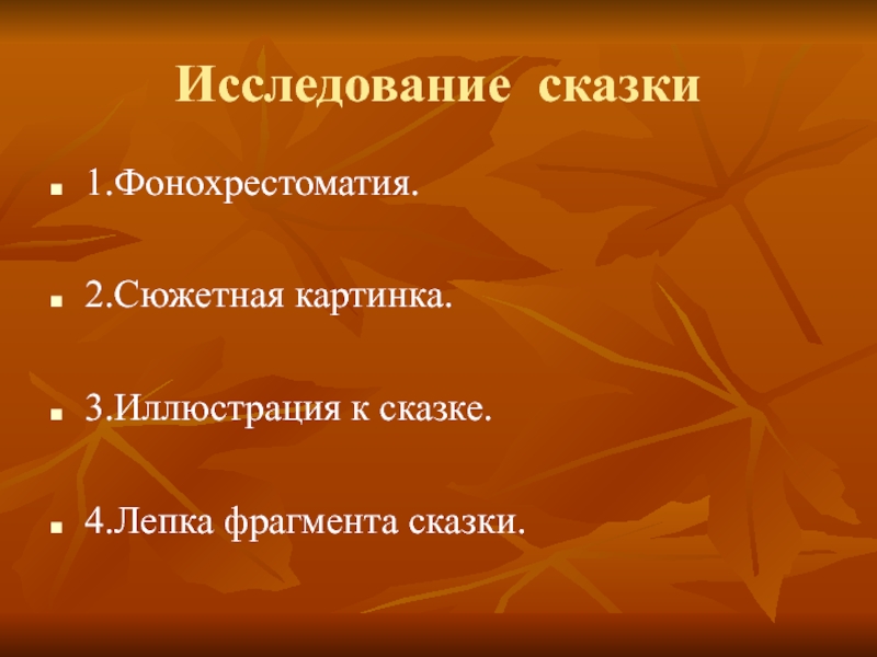 Исследование сказки1.Фонохрестоматия.2.Сюжетная картинка.3.Иллюстрация к сказке.4.Лепка фрагмента сказки.