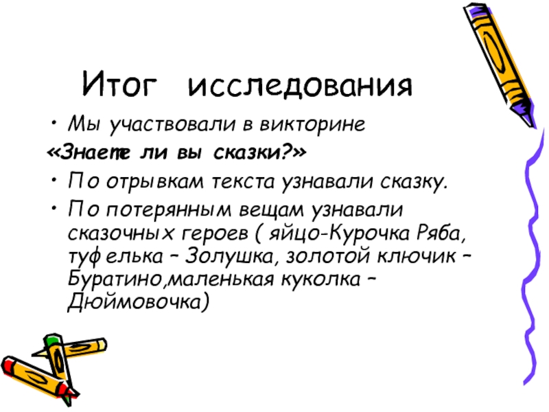 Итог  исследованияМы участвовали в викторине«Знаете ли вы сказки?»По отрывкам текста узнавали сказку.По потерянным вещам узнавали сказочных