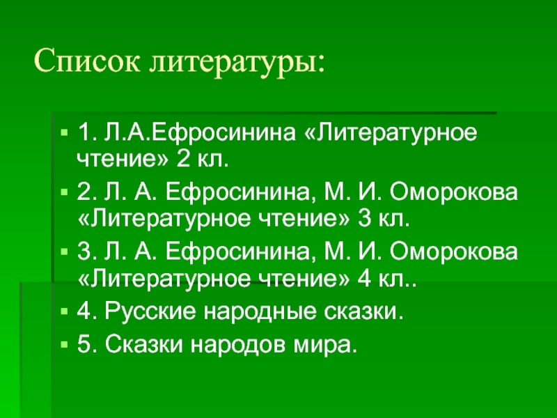 Список литературы:1. Л.А.Ефросинина «Литературное чтение» 2 кл.2. Л. А. Ефросинина, М. И. Оморокова «Литературное чтение» 3 кл.3.