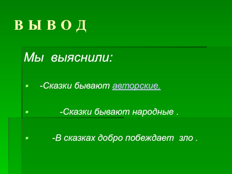 В Ы В О ДМы выяснили:  -Сказки бывают авторские.      -Сказки бывают