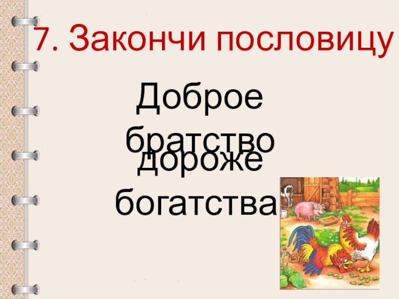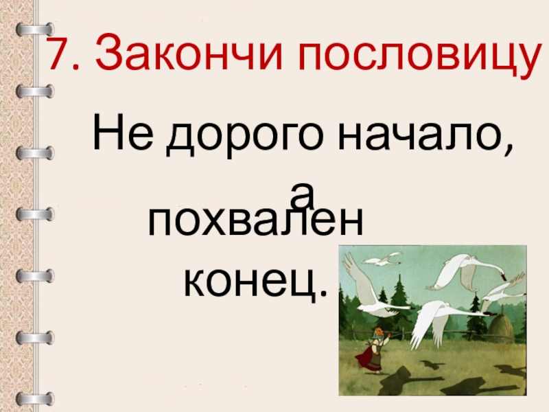 7. Закончи пословицуНе дорого начало, апохвален конец.