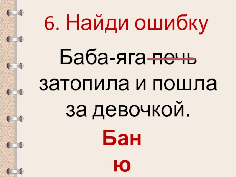 6. Найди ошибкуБаба-яга печь затопила и пошла за девочкой.Баню