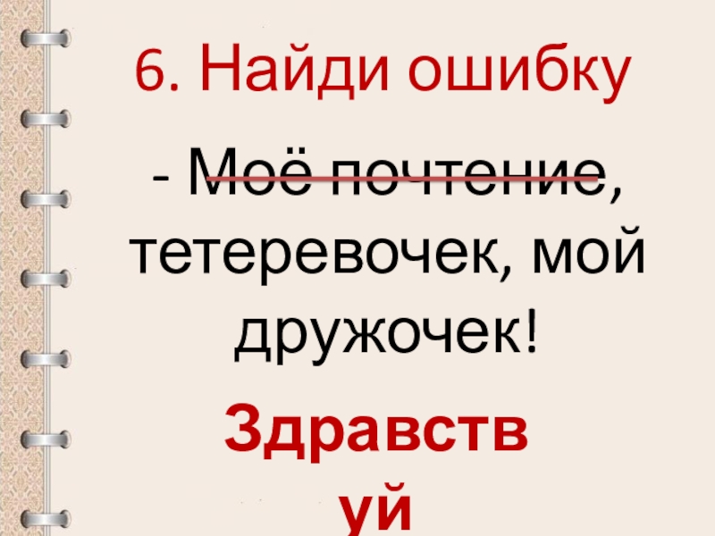 6. Найди ошибку- Моё почтение, тетеревочек, мой дружочек!Здравствуй