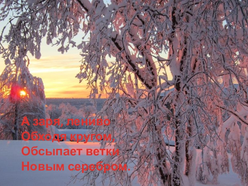 А заря, ленивоОбходя кругом,Обсыпает веткиНовым серебром.