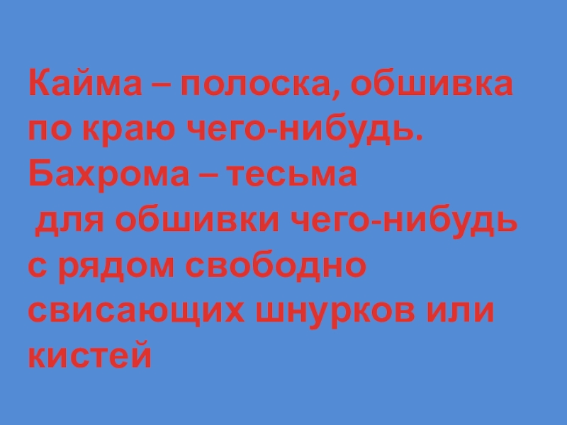 Кайма – полоска, обшивкапо краю чего-нибудь.Бахрома – тесьма для обшивки чего-нибудьс рядом свободно свисающих шнурков или кистей