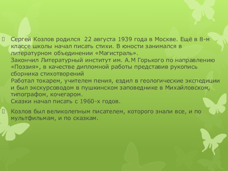 Слайд 2Сергей Козлов родился 22 августа 1939 года в Москве. Ещё в