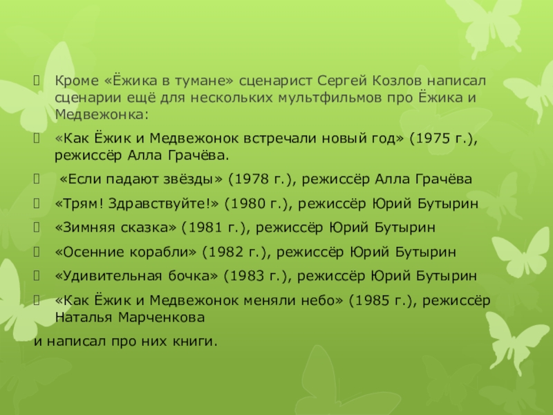 Слайд 4Кроме «Ёжика в тумане» сценарист Сергей Козлов написал сценарии ещё для