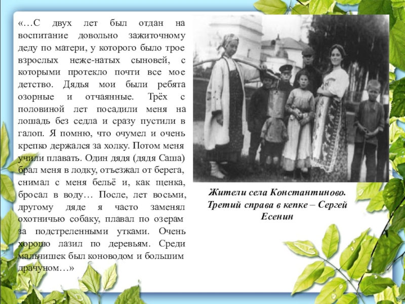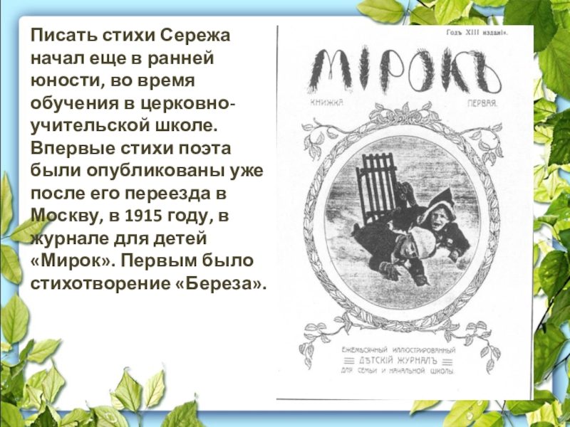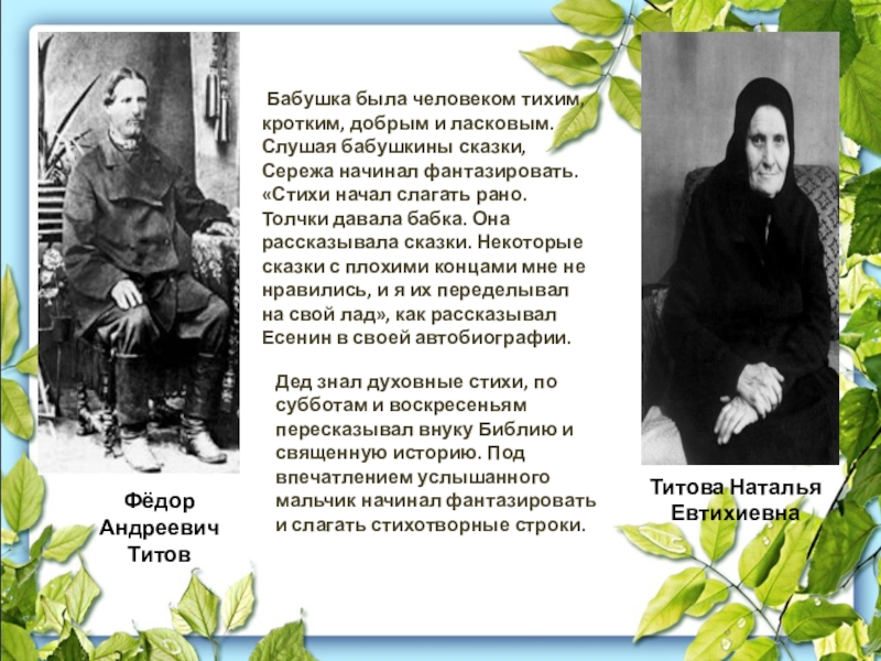 Дед знал духовные стихи, по субботам и воскресеньям пересказывал внуку Библию и священную историю. Под впечатлением услышанного мальчик начинал фантазировать и слагать стихотворные строки.