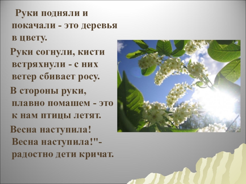 Руки подняли и покачали - это деревья в цвету.  Руки согнули, кисти встряхнули