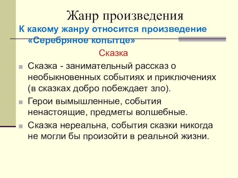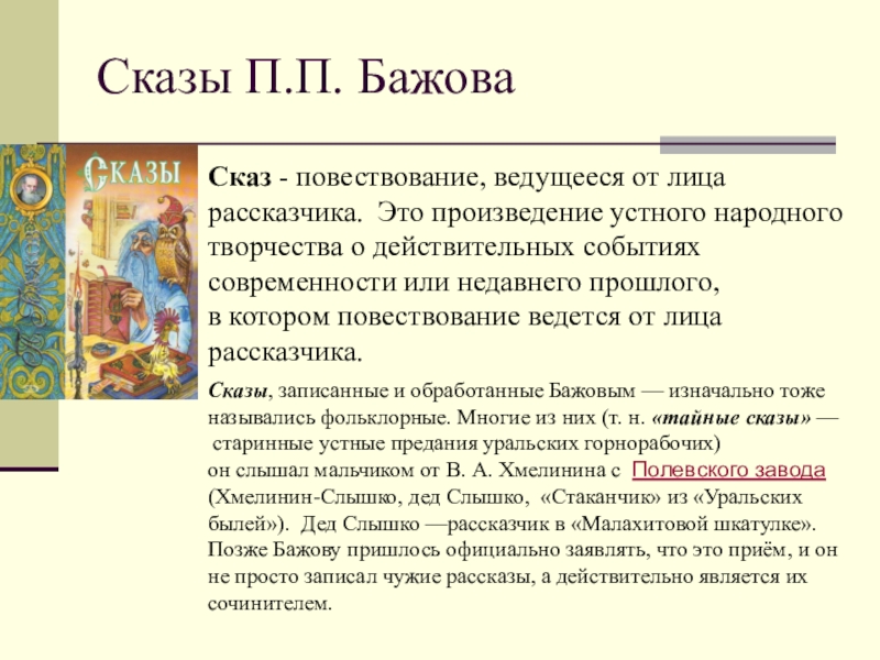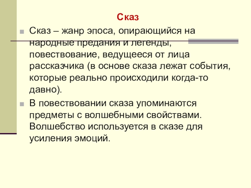 Сказ - повествование, ведущееся от лица рассказчика. Это произведение устного народного творчества о действительных событиях
