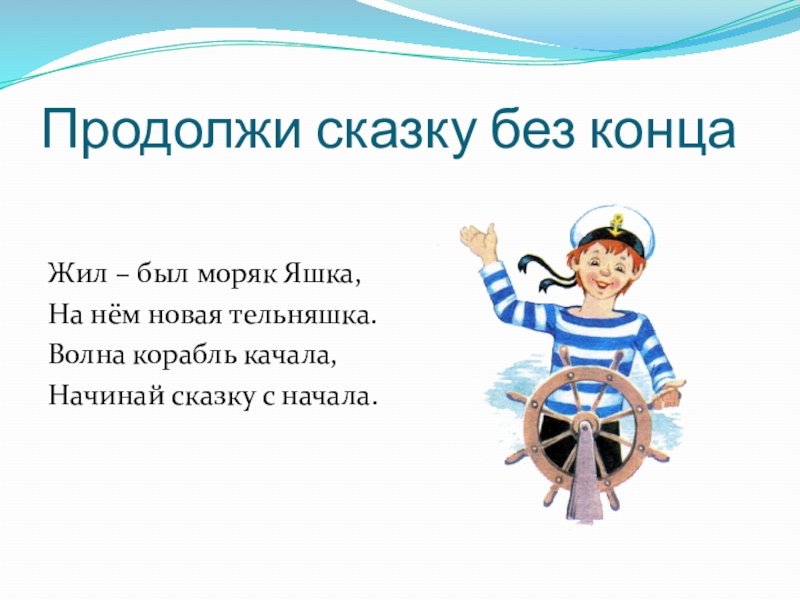 Продолжи сказку без концаЖил – был моряк Яшка,На нём новая тельняшка.Волна корабль качала,Начинай сказку с начала.