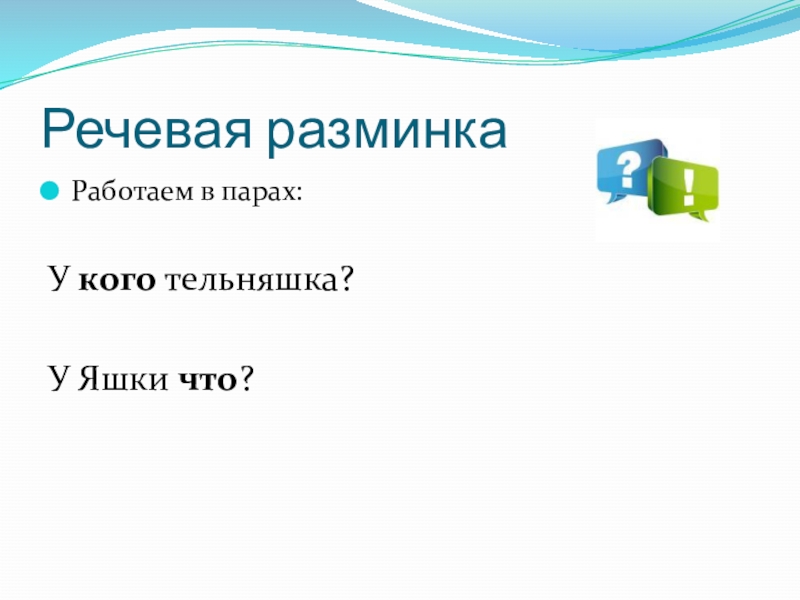 Речевая разминкаРаботаем в парах:У кого тельняшка?  У Яшки что?У Яшки тельняшка.У Яшки тельняшка.
