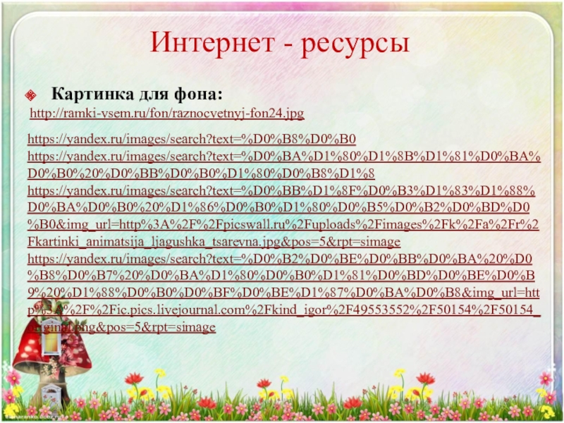 Интернет - ресурсыКартинка для фона:http://ramki-vsem.ru/fon/raznocvetnyj-fon24.jpg  https://yandex.ru/images/search?text=%D0%B8%D0%B0https://yandex.ru/images/search?text=%D0%BA%D1%80%D1%8B%D1%81%D0%BA%D0%B0%20%D0%BB%D0%B0%D1%80%D0%B8%D1%8https://yandex.ru/images/search?text=%D0%BB%D1%8F%D0%B3%D1%83%D1%88%D0%BA%D0%B0%20%D1%86%D0%B0%D1%80%D0%B5%D0%B2%D0%BD%D0%B0&img_url=http%3A%2F%2Fpicswall.ru%2Fuploads%2Fimages%2Fk%2Fa%2Fr%2Fkartinki_animatsija_ljagushka_tsarevna.jpg&pos=5&rpt=simagehttps://yandex.ru/images/search?text=%D0%B2%D0%BE%D0%BB%D0%BA%20%D0%B8%D0%B7%20%D0%BA%D1%80%D0%B0%D1%81%D0%BD%D0%BE%D0%B9%20%D1%88%D0%B0%D0%BF%D0%BE%D1%87%D0%BA%D0%B8&img_url=http%3A%2F%2Fic.pics.livejournal.com%2Fkind_igor%2F49553552%2F50154%2F50154_original.png&pos=5&rpt=simage