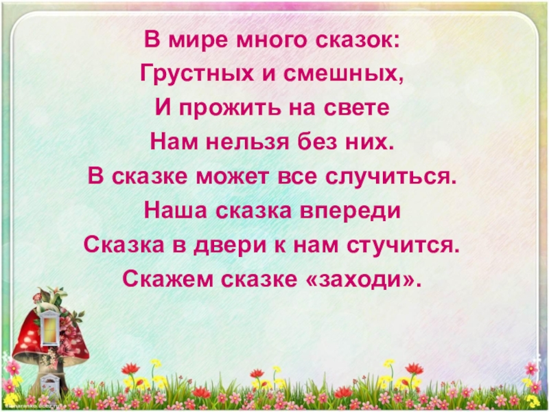 В мире много сказок: Грустных и смешных,И прожить на светеНам нельзя без них.В сказке может все случиться.Наша сказка впередиСказка в двери к нам стучится.Скажем сказке «заходи».