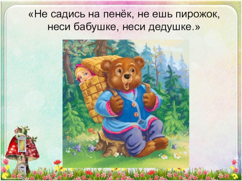 Слайд 17«Не садись на пенёк, не ешь пирожок, неси бабушке, неси дедушке.»