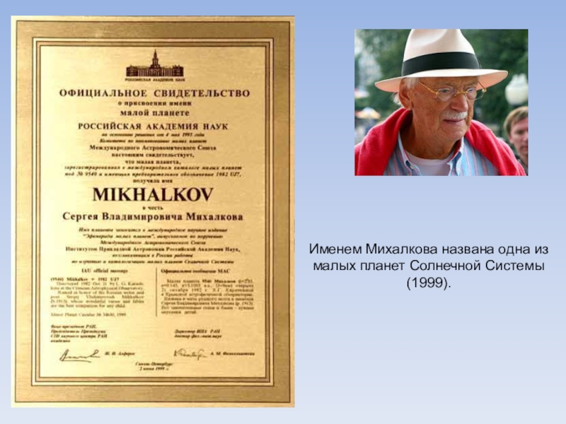 Слайд 14Именем Михалкова названа одна из малых планет Солнечной Системы (1999).