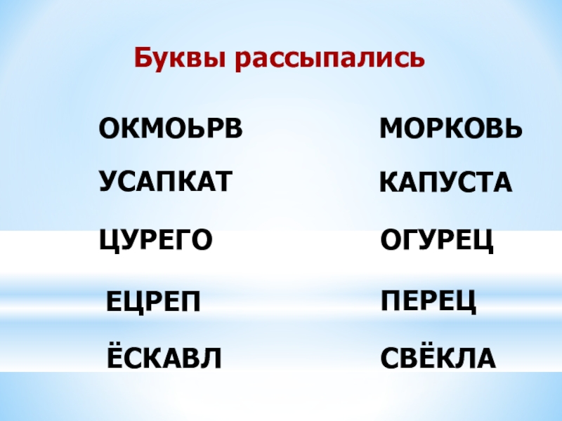 Буквы рассыпалисьУСАПКАТОКМОЬРВЕЦРЕПЦУРЕГОЁСКАВЛСВЁКЛАПЕРЕЦОГУРЕЦКАПУСТАМОРКОВЬ