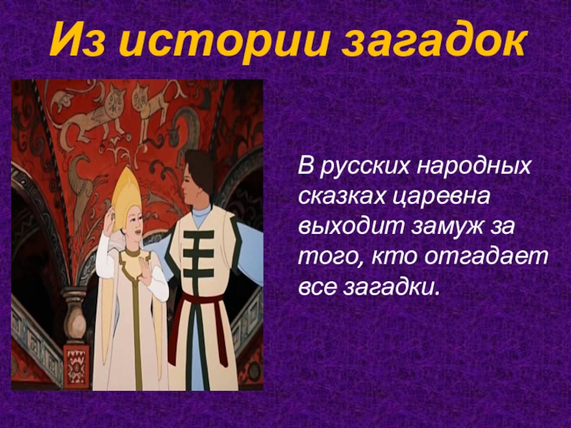 Из истории загадок В русских народных сказках царевна выходит замуж за того, кто отгадает все загадки.