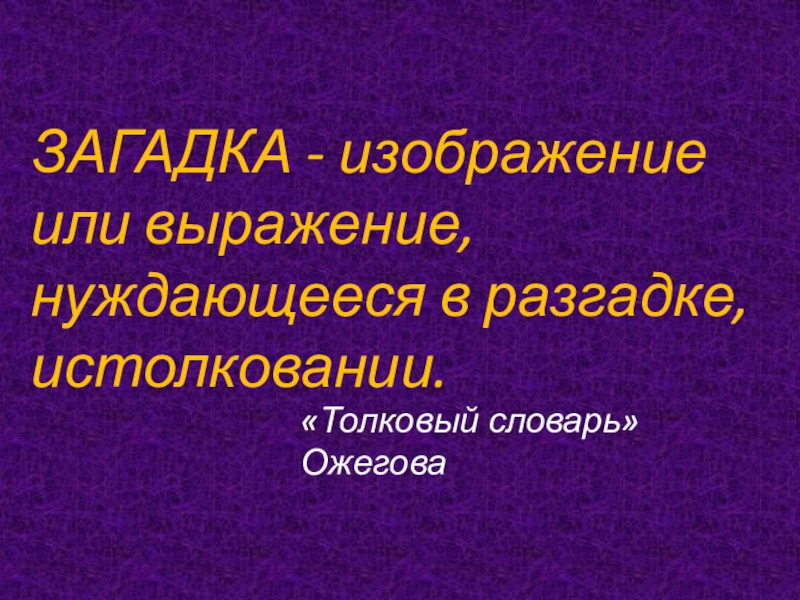 ЗАГАДКА - изображение или выражение, нуждающееся в разгадке, истолковании. «Толковый словарь» Ожегова