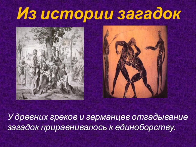 Из истории загадок У древних греков и германцев отгадывание загадок приравнивалось к единоборству.