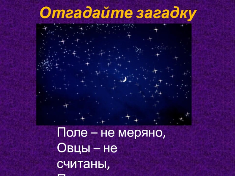 Отгадайте загадку Поле – не меряно,Овцы – не считаны,Пастух – рогат.