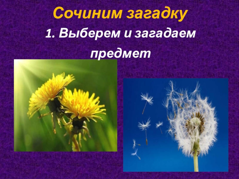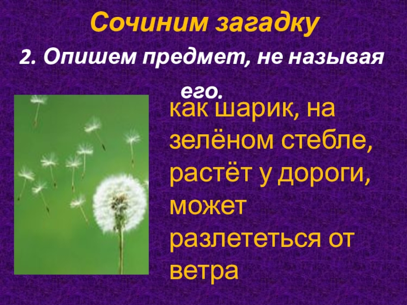 Сочиним загадку 2. Опишем предмет, не называя его. как шарик, на зелёном стебле, растёт у дороги, может разлететься от