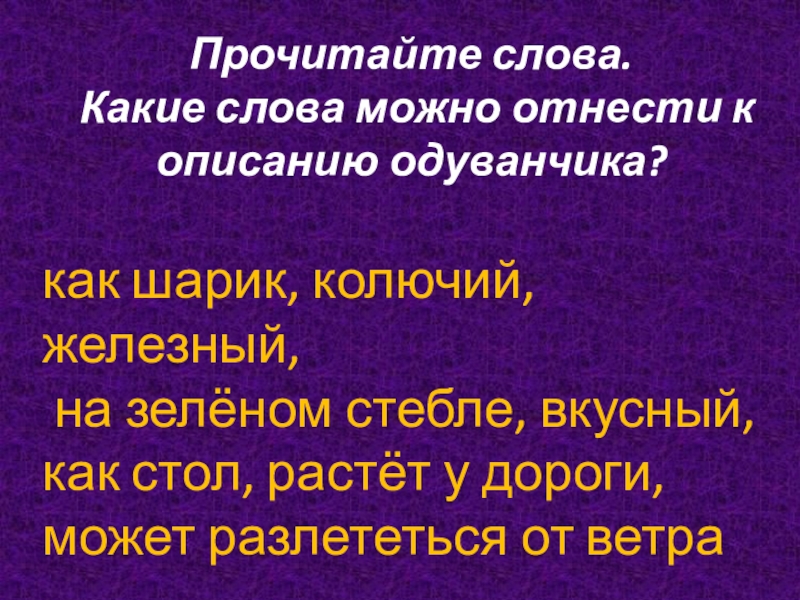 Прочитайте слова. Какие слова можно отнести к описанию одуванчика? как шарик, колючий, железный, на зелёном стебле, вкусный, как