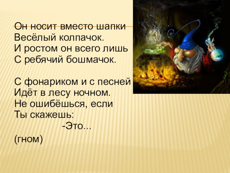 Он носит вместо шапки Весёлый колпачок. И ростом он всего лишь С ребячий бошмачок. С