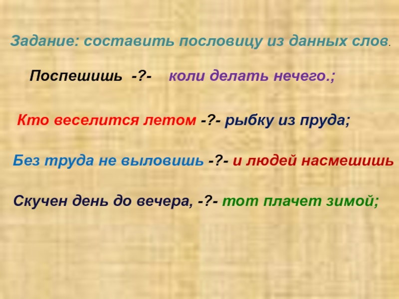 Задание: составить пословицу из данных слов.