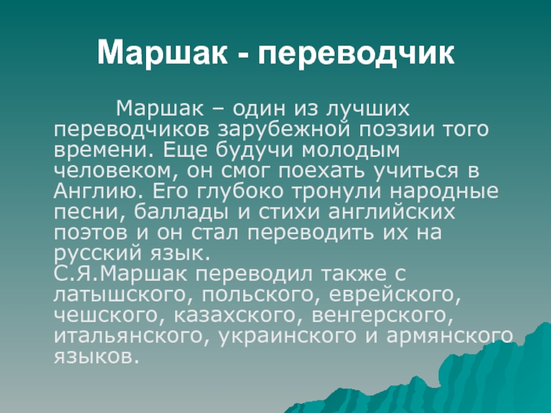 из лучших переводчиков зарубежной поэзии того времени. Еще будучи молодым человеком, он смог поехать учиться в Англию. Его глубоко тронули народные песни, баллады и стихи английских поэтов и он стал переводить их на русский язык. С.Я.Маршак переводил также с латышского, польского, еврейского, чешского, казахского, венгерского, итальянского, украинского и армянского языков.