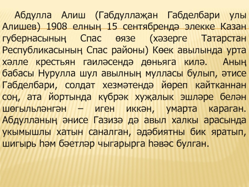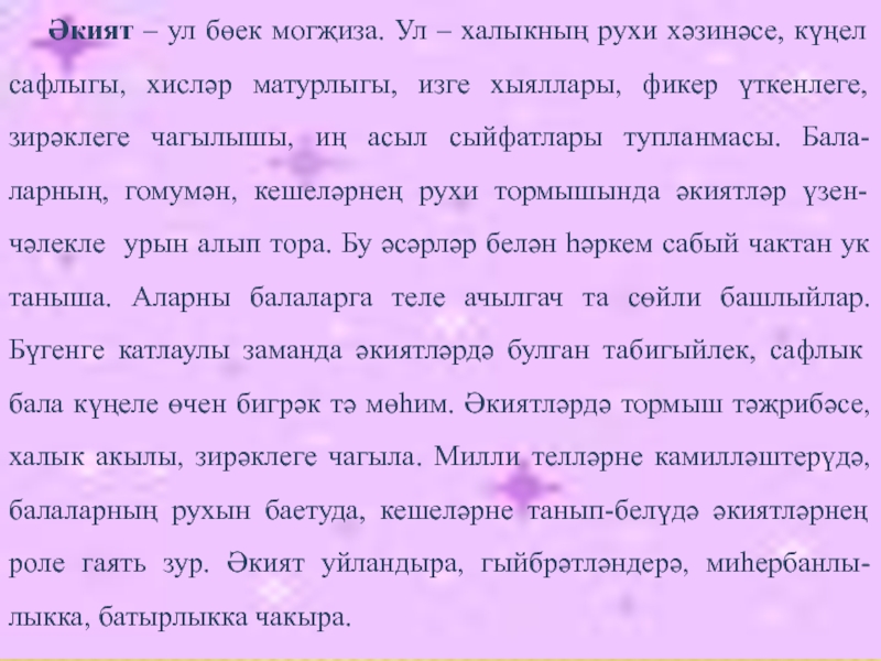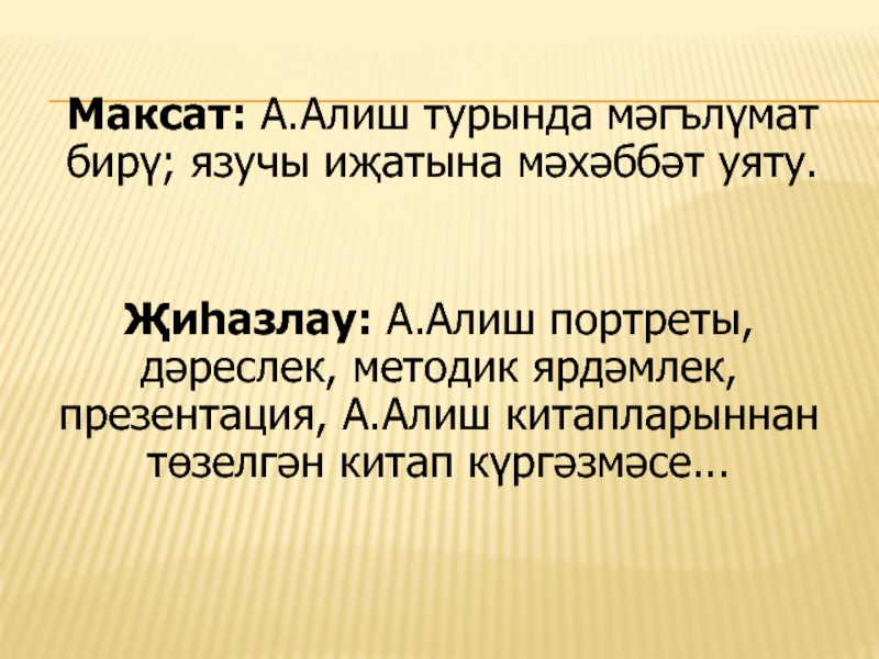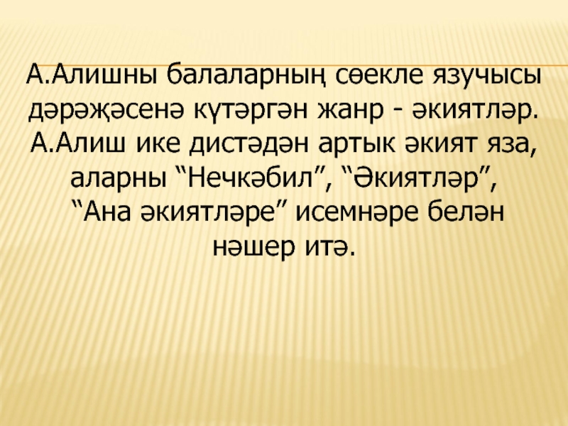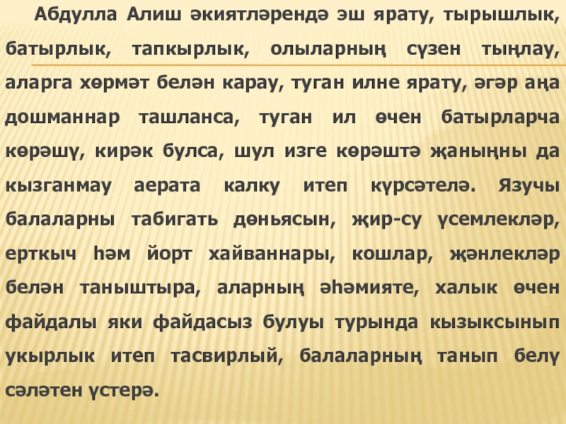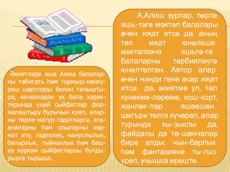 Әкиятләре аша Алиш балалар-ны табигать һәм тормыш-көнкү-реш шартлары белән танышты-ра, кечкенәдән үк бала харак-терында уңай сыйфатлар фор-малаштыру бурычын куеп, алар-ны төрле матур гадәтләргә, ата-аналарны һәм олыларны хөр-мәт итү, гаделлек, намуслылык, батырлык, тыйнаклык һәм баш-ка күркәм сыйфатларны булды-рырга тырыша.