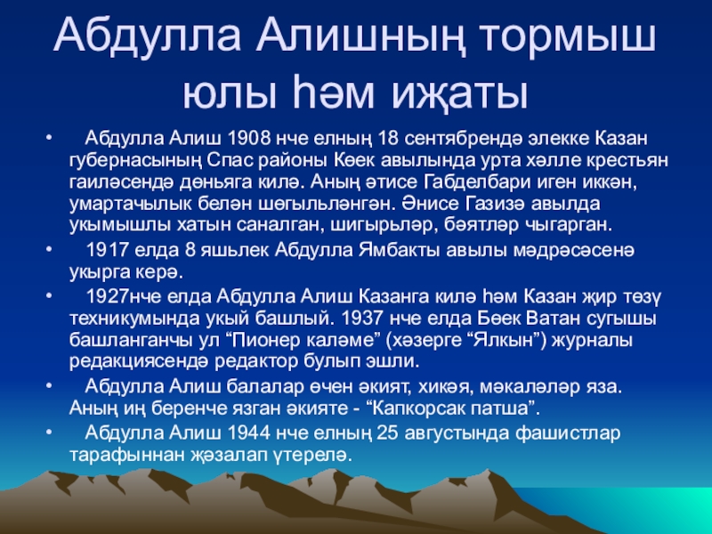 Слайд 3Абдулла Алишның тормыш юлы һәм иҗаты