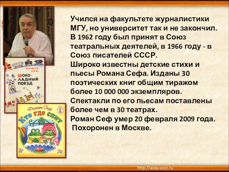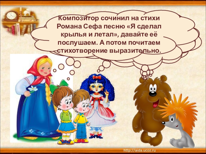 Композитор сочинил на стихи Романа Сефа песню «Я сделал крылья и летал», давайте её послушаем. А потом почитаем стихотворение выразительно.