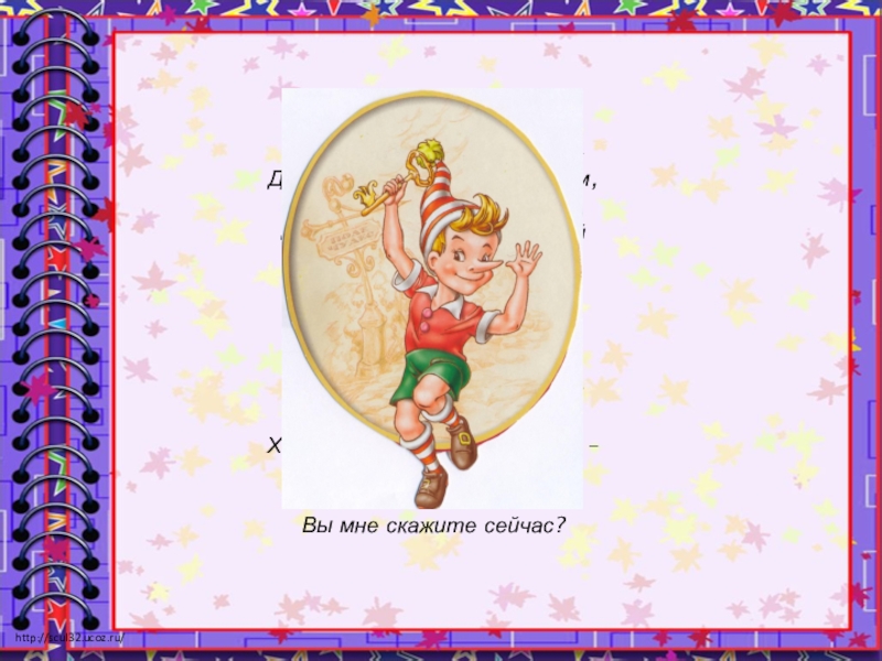 Далеко, на теплом мореПоявился вдруг мальчишка –Деревянный, с длинным носом,Про него создали книжку.В книжке много приключенийТот мальчишка