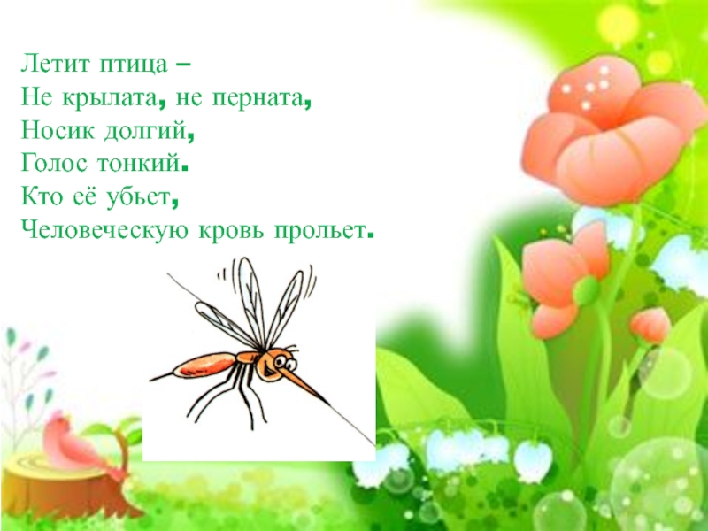 Летит птица – Не крылата, не перната,Носик долгий,Голос тонкий.Кто её убьет,Человеческую кровь прольет.