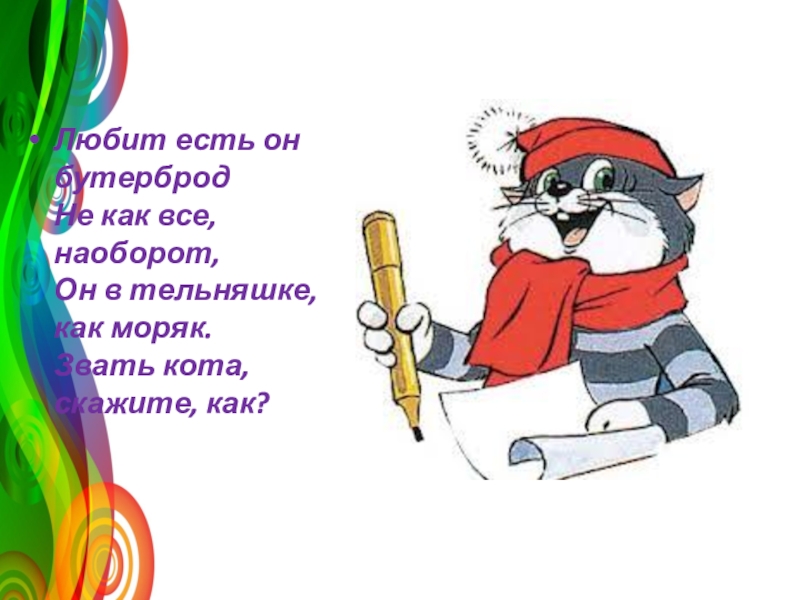 Любит есть он бутерброд Не как все, наоборот, Он в тельняшке, как моряк. Звать кота, скажите, как?