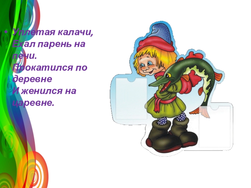 Слайд 3Уплетая калачи, Ехал парень на печи. Прокатился по деревне И женился на царевне.