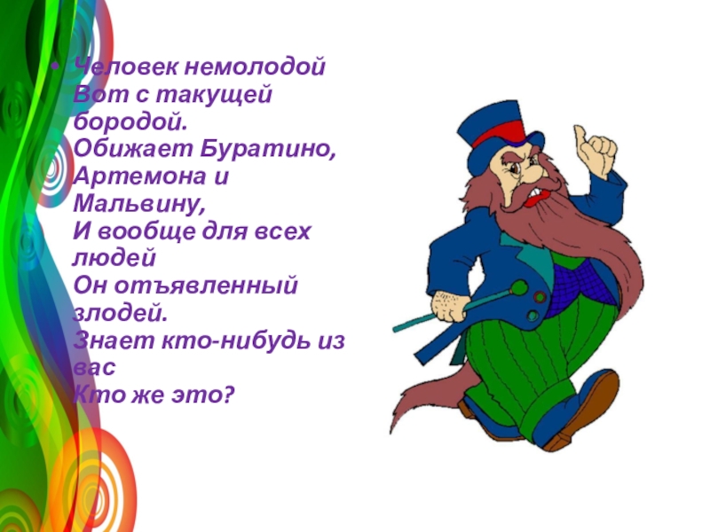 Человек немолодой Вот с такущей бородой. Обижает Буратино, Артемона и Мальвину, И вообще для всех людей Он