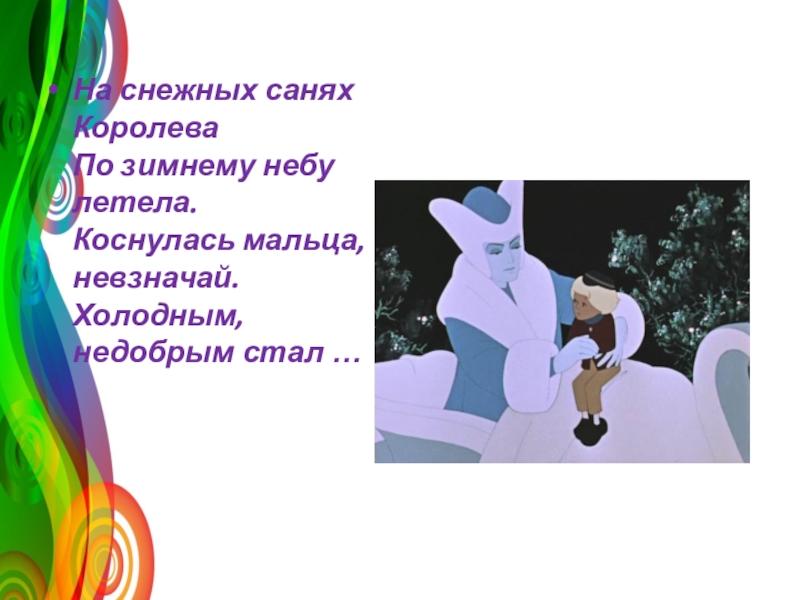 Слайд 6На снежных санях Королева По зимнему небу летела. Коснулась мальца, невзначай. Холодным, недобрым стал