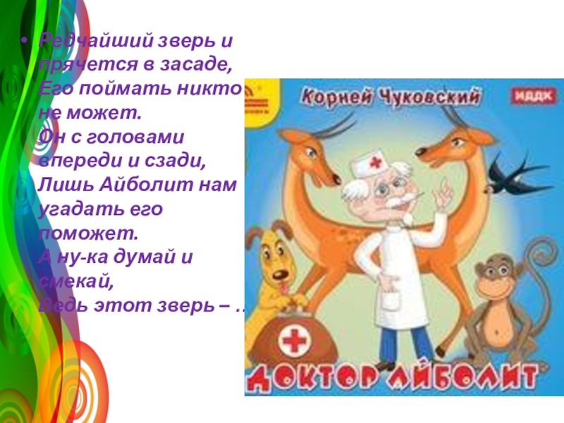 Редчайший зверь и прячется в засаде, Его поймать никто не может. Он с головами впереди и сзади, Лишь Айболит нам угадать его поможет. А ну-ка думай и смекай, Ведь этот зверь – …
