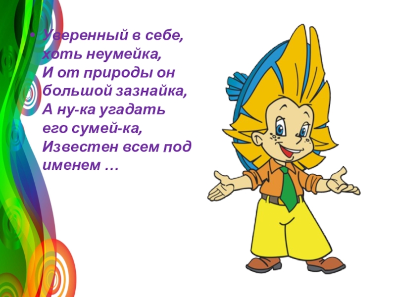 Уверенный в себе, хоть неумейка, И от природы он большой зазнайка, А ну-ка угадать его сумей-ка, Известен