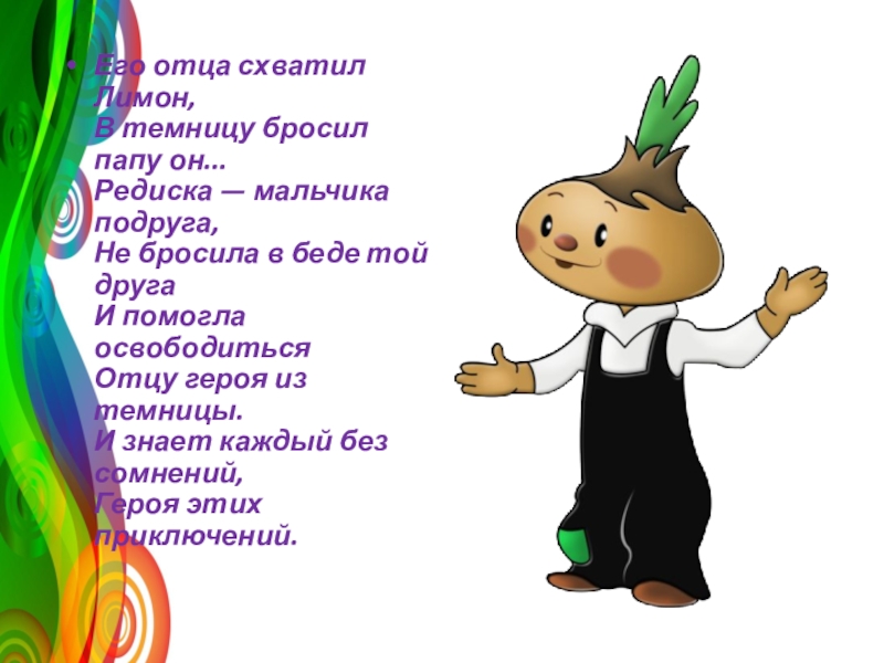 Его отца схватил Лимон, В темницу бросил папу он... Редиска — мальчика подруга, Не бросила в беде