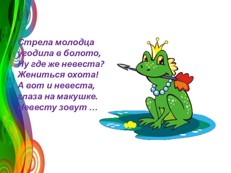 Слайд 9Стрела молодца угодила в болото, Ну где же невеста? Жениться охота! А вот