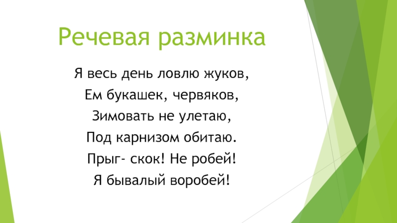 Речевая разминкаЯ весь день ловлю жуков,Ем букашек, червяков,Зимовать не улетаю,Под карнизом обитаю.Прыг- скок! Не робей!Я бывалый воробей!