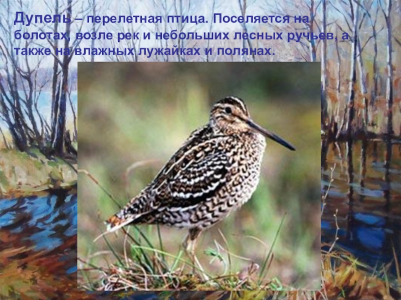 Дупель – перелетная птица. Поселяется на болотах, возле рек и небольших лесных ручьев, а также на влажных лужайках и полянах.